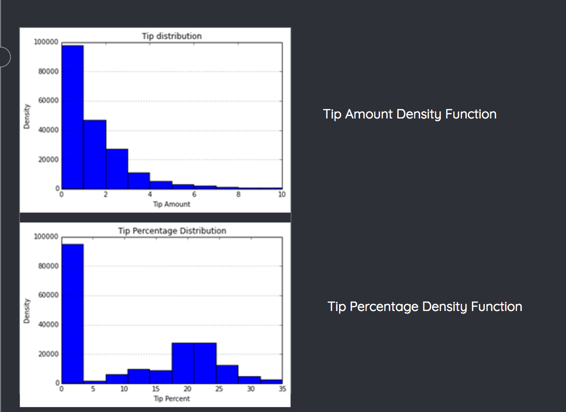 Since we found the data to be skewed for wait times, we wanted to confirm that was not the case for tip amounts. We found 50% of the data had zero tip. So, we were safe here. Our generic approach was to visualize the data to understand it better. This would give us information about outliers and incorrect (absurd values) that need to be removed. Apart from data cleaning, the other important affordance of the visualizations is the correlation we can derive between the different attributes and the tip amount.
